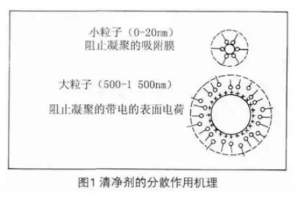 分散作用又可稱為懸浮或膠溶,即清凈劑能將已經(jīng)形成的漆膜、膠質(zhì)和積炭等固體小顆粒加以吸附,在其表面形成一層覆蓋膜而分散在油中,阻止這些非油溶性顆粒聚集成較大的顆粒沉積或黏附于氣缸上。清凈劑的分散作用機理見圖1。